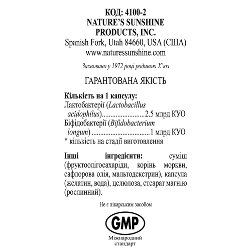 Состав - 1 капсула: лактобактерии (Lactobacillus acidophilus) - 25 x 108 КОЕ*; бифидобактерии (Bifidobacterium longum) - 10 x 108 КОЕ*; Фруктоолигосахариды, порошок моркови, мальтодекстрин, масло сафлоры - 470 мг.