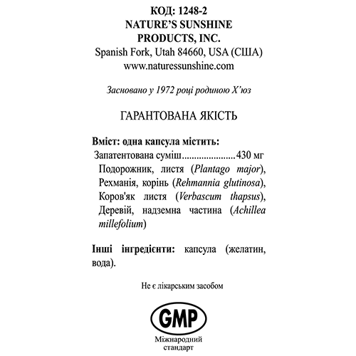 Состав – 1 капсула: листья подорожника (Plantago major) - 126,2 мг; корень рехмании (Rehmannia glutinosa) - 110,0 мг; листья коровяка (Verbascum thapsus) - 91,5 мг; надземные части тысячелистника (Achilleamille folium) - 91,5 мг.