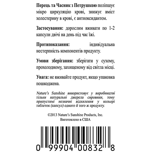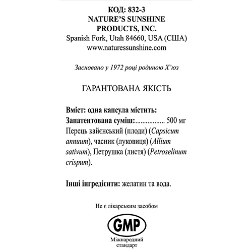 Состав - 1 капсула: чеснок посевной (Allium sativum) - 250 мг; перец кайенский (Capsicum annuum) - 125 мг; петрушка посевная (Petroselinum crispum) - 125 мг.