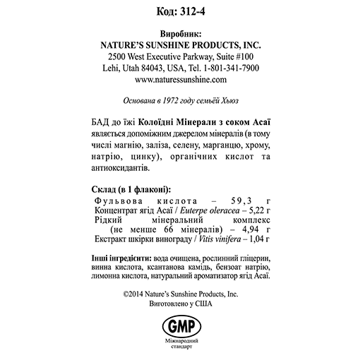 БАД Коллоидные минералы содержит концентрированный комплекс из 74 (макро- и микроэлементов), которые получены из воды Великого Соляного Озера (штат Юта, США) путем специальной технологии. В наибольшем количестве содержатся: магний, железо, селен, марганец, хром, натрий, цинк. Особый интерес вызывает наличие в составе БАД фульвовой кислоты. Это комплекс гуминовых веществ, которые переводят минеральные вещества в хелатные соединения, что повышает их усвояемость. В формуле присутствует сок ягод Асаи, которые вызвали «бум здоровья» во всём мире, а также экстракт кожуры винограда, содержащий флавоноиды. В ягодах Асаи содержатся различные биологически активные вещества, витамины, микроэлементы, стерины и антиоксиданты (флавоноиды, цианидины).