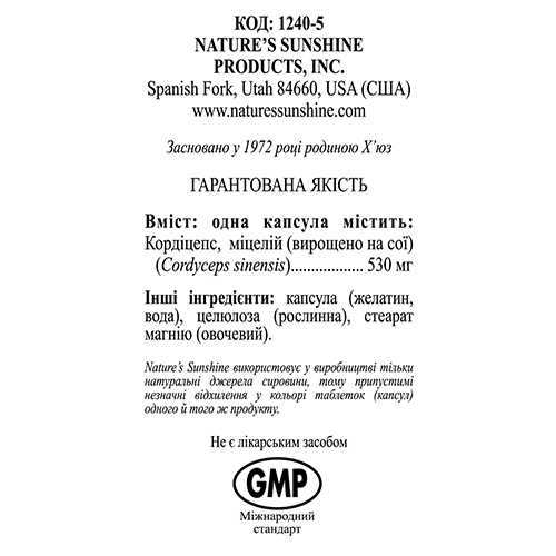 Состав - 1 капсула: порошок кордицепса китайского (Cordyceps sinensis) - 530 мг.