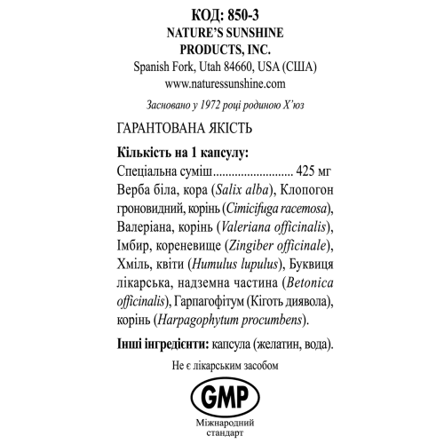 Состав - 1 капсула: кора ивы белой (Salix alba) - 100 мг; корень клопогона кистевидного (Cimicifuga racemosa) - 73 мг; плоды кайенского перца (Capsicum annuum) - 65 мг; корень валерианы лекарственной (Valeriana officinalis) - 58 мг; корень имбиря лекарственного (Zingiber officinale) - 56 мг; шишки хмеля обыкновенного (Humulus lupulus) - 35 мг; трава буквицы лекарственной (Betonica officinalis) - 35 мг; корень мартинии душистой (Harpagophytum procumbens) - 3 мг.