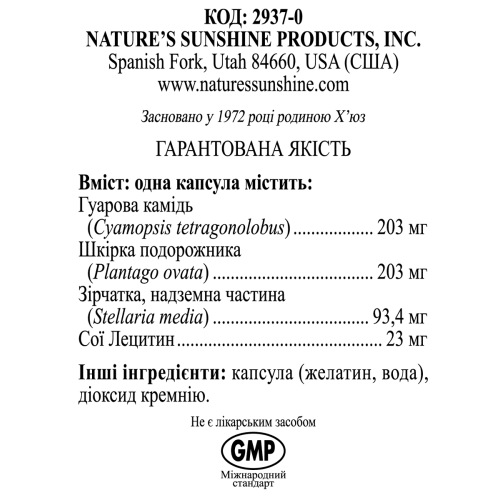 Состав - 1 капсула: гуаровая камедь (Cyamopsistetragonolobus) - 203 мг; оболочка семян подорожника (Plantagoovata) - 203 мг; трава звездчатки (Stellariamedia) - 93,4 мг; лецитин - 23 мг (0,33% от АСП).