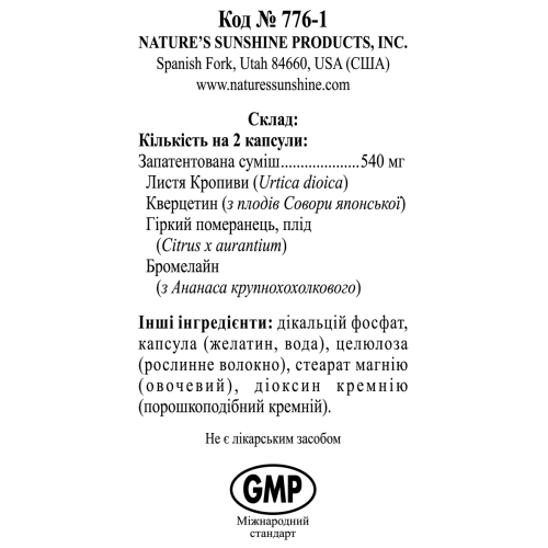 Состав - 1 капсула: кверцитин (экстракт плодов софоры японской - 84%) - 90 мг (75,6 мг - 252% от АСП); листья крапивы двудомной (Urtica dioica) - 90 мг; порошок плодов померанца (Citrus aurantium) - 70 мг; бромелайн (экстракт ананаса - 21,5%) - 20 мг; кальций (в дикальция фосфате) - 33 мг (3,3% от АСП).