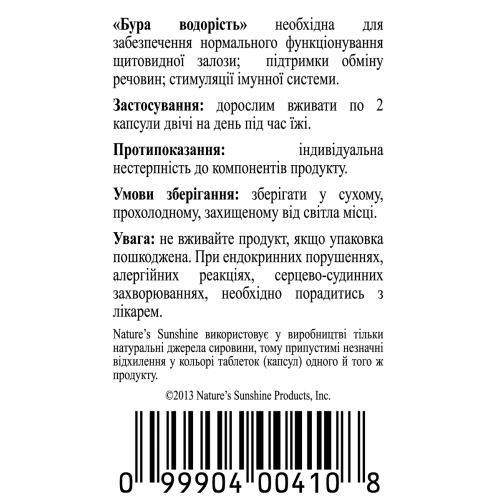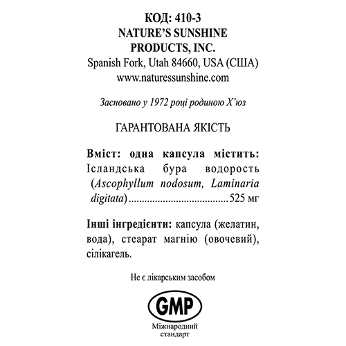Состав - 1 капсула: бурая водоросль (Ascophyllum nodosum и Laminaria digitata) - 525 мг.
