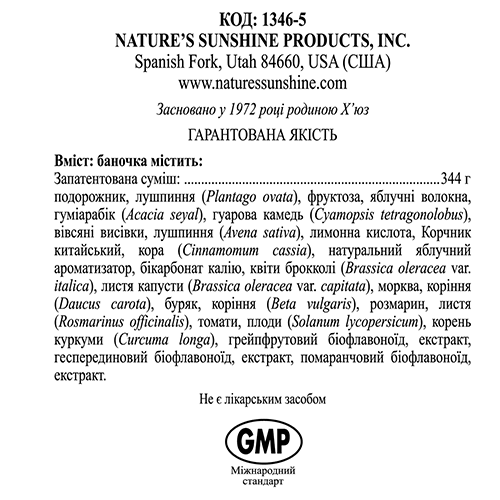 Состав (1 столовая ложка – 9 г): фруктоза - 2,17 г (6,18% от АСП); шелуха семян подорожника яйцевидного (Plantago ovata) - 2223 мг; пектин яблочный - 1502 мг; овсяные отруби (Avena sativa) - 751 мг; гуаровая камедь (Cyamopsis tetragonolobus) - 751 мг; смола акации (Acacia seyal) - 751 мг; кора корицы (Cinnamomum cassia) - 290 мг; цветы брокколи (Brassica oleracea) - 20 мг; корень куркумы длинной (Curcuma longa) - 6 мг; листья розмарина лекарственного (Rosmarinus officinalis) - 6 мг; свекла красная (Beta vulgaris) - 6 мг;томат (Solanum lycopersicum) - 6 мг; морковь (Daucus carota) - 6 мг; листья капусты огородной (Brassica oleracea) - 6 мг; биофлавоноиды апельсина, биофлавоноиды грейпфрута - 6,6 мг (2,64% от АСП); гесперидин - 15,0 мг (7,5 % от АСП).