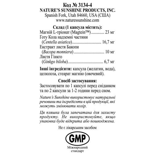 Состав – 1 капсула: магний L-треонат - 23 мг (5,8% от АСП); надземные части готу кола (Centella asiatica) -16,7 мг; экстракт листьев бакопы (Bacopa monniera) -10,0 мг; листья гинкго билоба (Ginkgo biloba) - 6,7 мг.