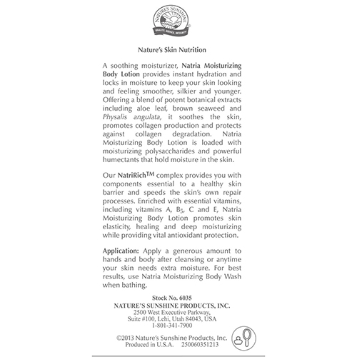 КомплексNatriRichTM включает в себя компоненты, необходимые для защиты здоровой кожи, и ускоряет протекающие в ней естественные восстановительные процессы, способствуя правильному функционированию ее клеток. Обогащенное комплексом жизненно важных витаминов, в том числе А, В5, С и Е, увлажняющее молочко для тела Natria делает кожу здоровой, упругой и эластичной, глубоко питая и увлажняя ее, а также обеспечивая надежную антиоксидантную защиту Вашей кожи.