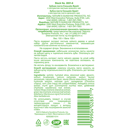 Экстракт листьев зеленого чая (Camelia sinesis) - содежит биофлавоноиды и дубильные вещества, благоприятно воздействующие на слизистую оболочку.