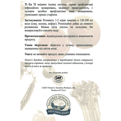 БАД к пище ТНТ является дополнительным источником пищевых волокон, витаминов (А, D, Е, С, B1, B2, B6, B12, PP, биотина, пантотеновой и фолиевой кислот), в-каротина и минеральных веществ (йода, кальция, хрома, меди, железа, магния, молибдена, селена, цинка), содержит лецитин, марганец, фосфор, калий.