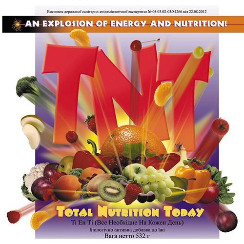ТNТ (TotalNutritionToday – Полноценное питание сегодня) – напиток, обогащенный необходимыми для организма 12 витаминами, 12 биоэлементами, содержит в-каротин и лецитин, а также смесь пищевых растительных волокон: гуммиарабик, рисовая мука, целлюлоза, каррагенан, клетчатка сои, овса, свеклы, гороха, яблока, овсяные и кукурузные отруби, гуаровая камедь в количестве 6,5 г (в том числе 4,5 г растворимых и 2 г – нерастворимых). ТНТ также содержит 500 мг молочного белка (казеинат натрия), 0,5 г высокоолеинового подсолнечного масла, 7,8 г углеводов в виде фруктозы, кукурузного сиропа и мальтодекстрина. Калорийность – около 70 ккал.