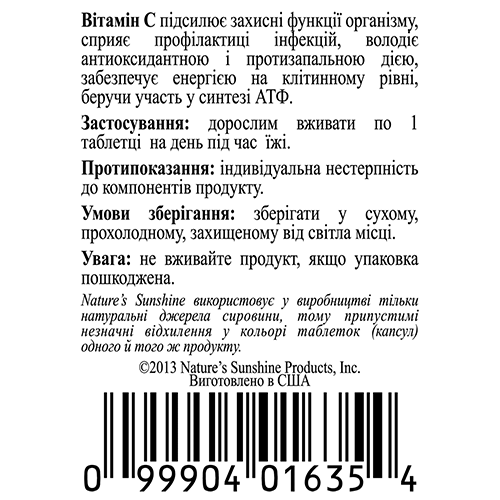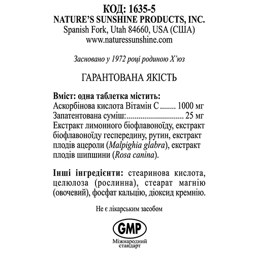 Состав - 1 таблетка: витамин С (аскорбиновая кислота) - 1000 мг (1111% от АСП); биофлавоноиды лимона - 5 мг (2% от АСП); гесперидин - 5 мг (2,5% от АСП); рутин - 5 мг (16,6% от АСП); экстракт из плодов мальпигии (Malpighia glabra) - 5 мг; экстракт из плодов шиповника собачьего (Rosa canina) - 5 мг.